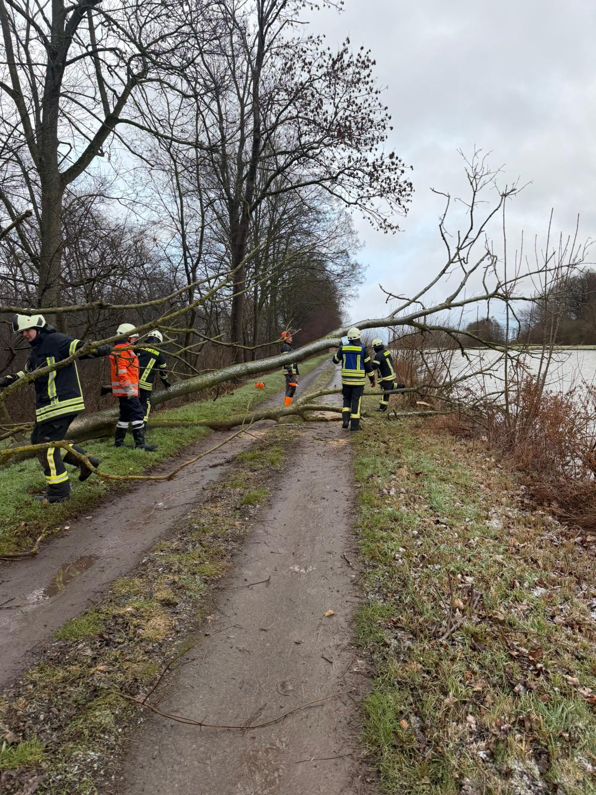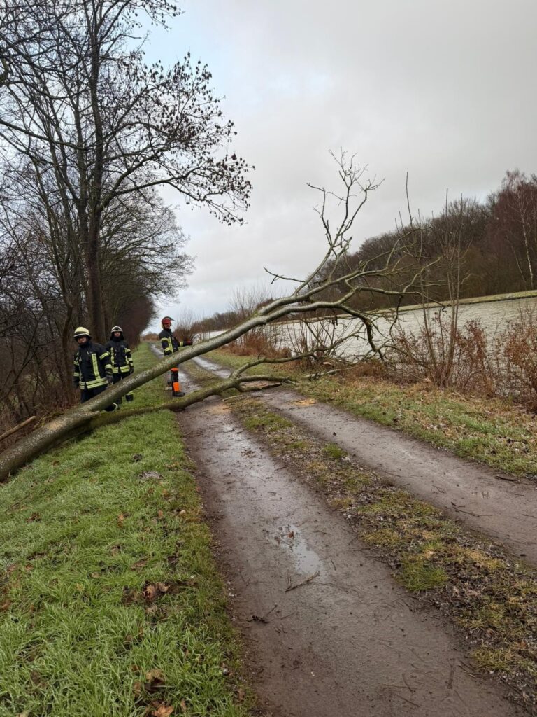 Durch den Sturm lag ein Baum auf dem Gehweg am Mittellandkanal. Zusätzlich ragte er in den Bereich des Wassers. Die Polizei bat uns darum, den Baum zu entfernen.